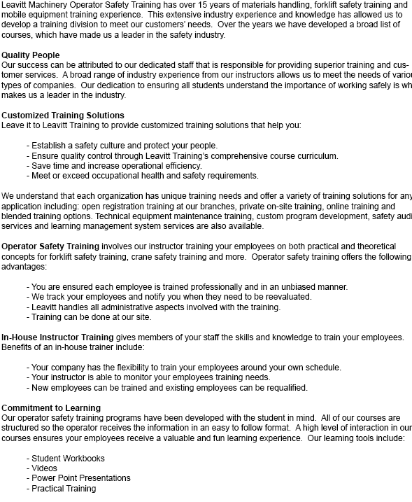 The considerable range of start times and courses we offer should make sure that you discover the ideal match for your needs. Training can be carried out at our location or at your facility. Our knowledgeable employees can tailor our instruction to your particular equipment at your location of operations.